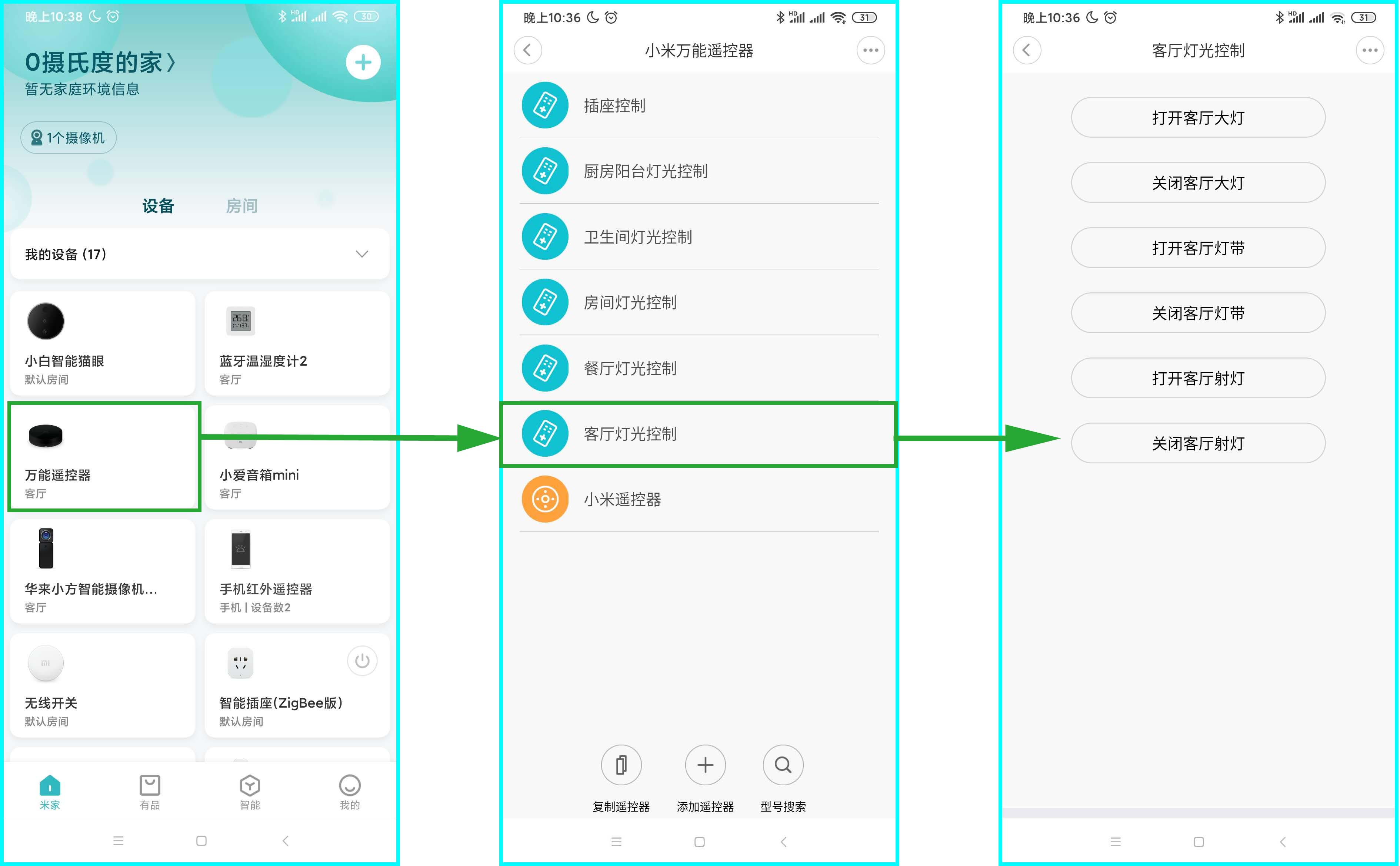 重复上述步骤,分别增加关闭客厅大灯、打开客厅灯带、关闭客厅灯带、打开餐厅大灯、关闭餐厅大灯......等等,上图最后一张手机截图就为我新增的部分的实例。