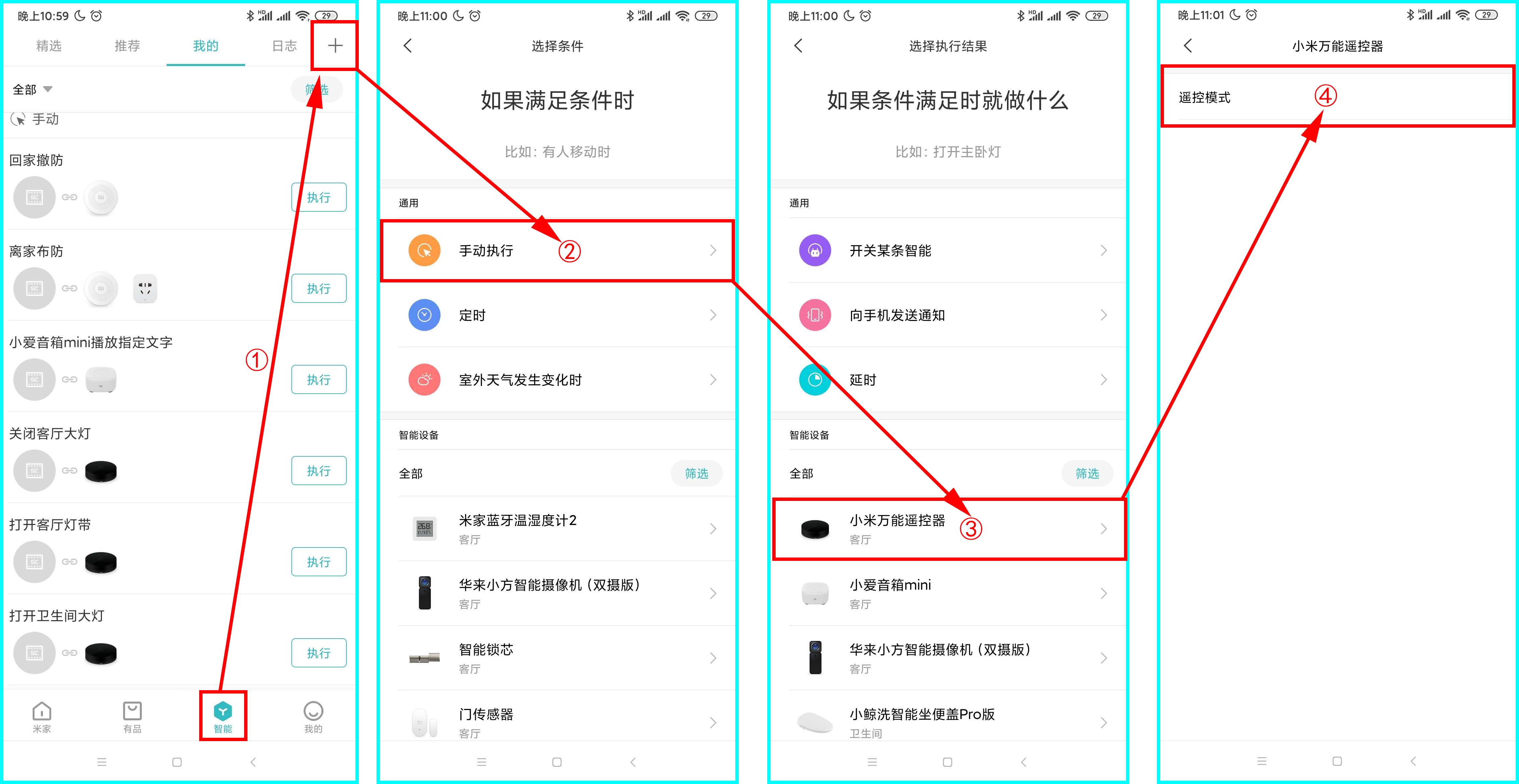 以新增打开客厅大灯为例,操作步骤如下:米家APP中--->智能--->新增--->手动执行--->小米万能遥控器--->遥控模式--->客厅灯光控制(这是我的分组)--->选择打开客厅大灯--->完成创建。具体操作如图: